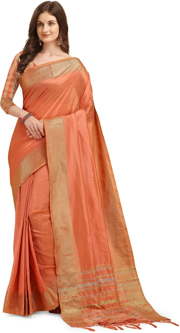 Beige & Orange Banarasi Kanjivaram Woven Cotton Silk Saree