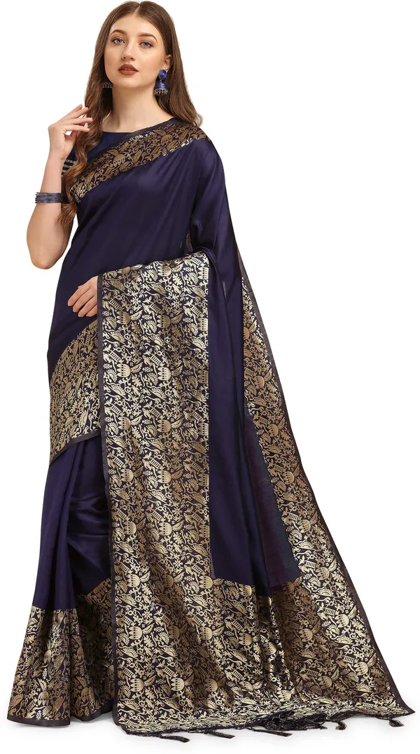 Dark Blue Banarasi Kanjivaram Woven Cotton Silk Saree