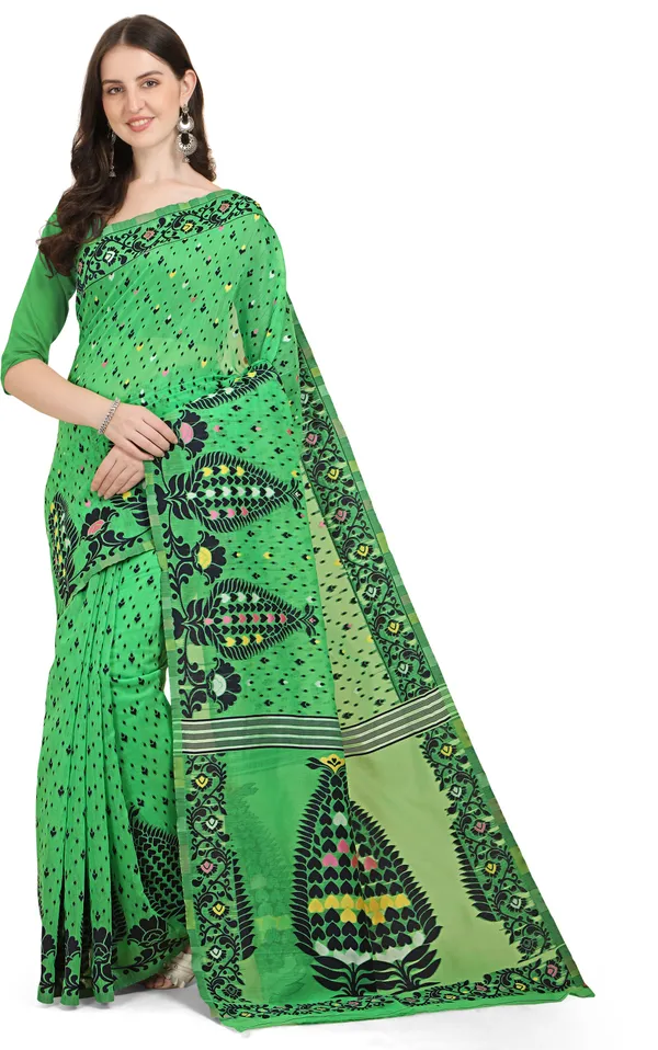Green Cotton Woven Soft Silk Dhakai Jamdani Saree
