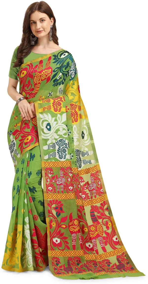Green Cotton Woven Soft Silk Dhakai Jamdani Saree