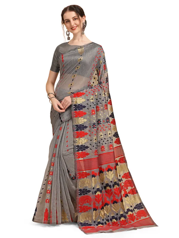 Grey Cotton Woven Soft Silk Dhakai Jamdani Saree