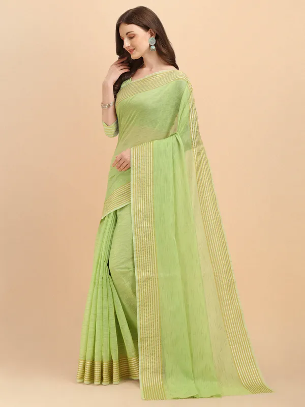 Light Green Woven Cotton Linen Saree With Jari Border