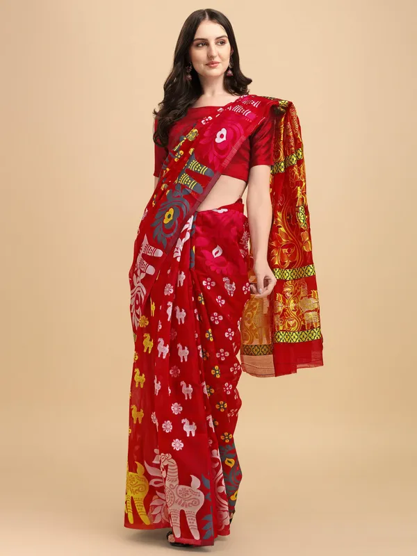 Red Cotton Woven Soft Silk Dhakai Jamdani Saree