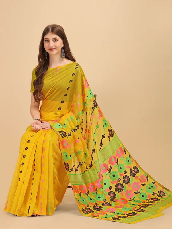 Yellow Cotton Woven Soft Silk Dhakai Jamdani Saree