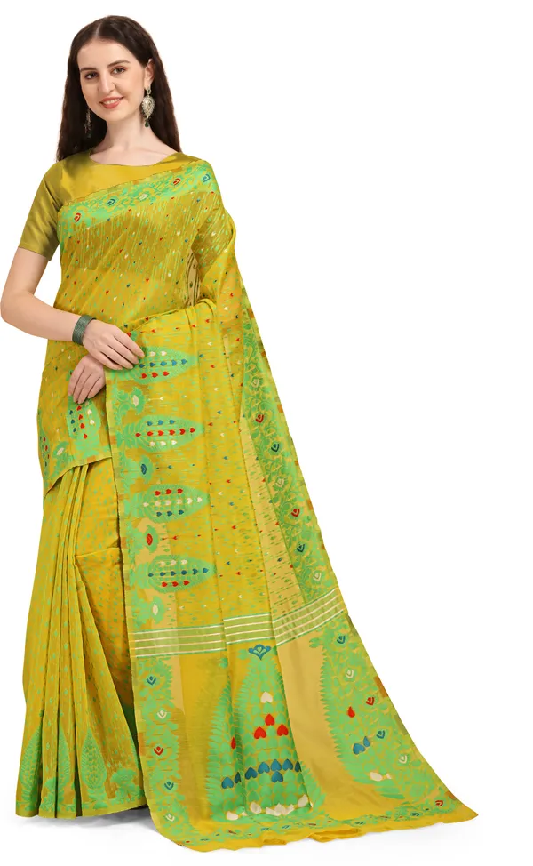 Yellow Cotton Woven Soft Silk Dhakai Jamdani Saree